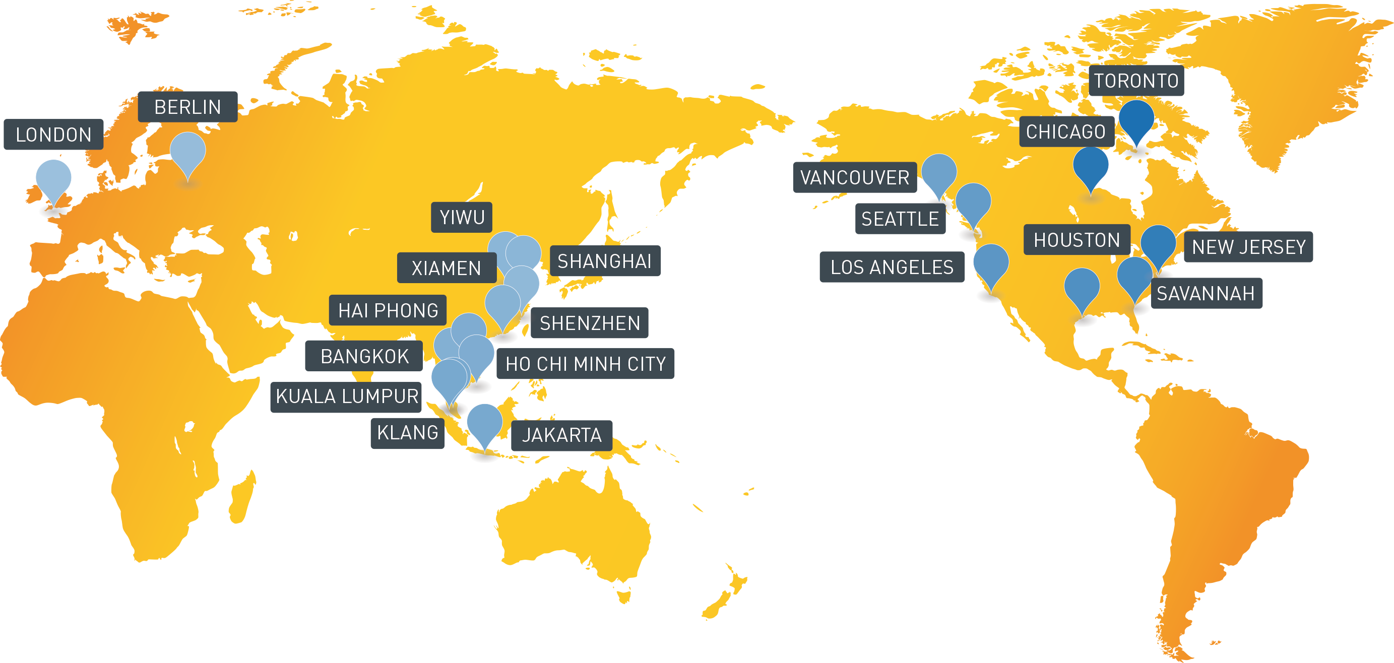 在北美、东南亚、欧洲设有办事处和仓库,为客户提供属地的海运、仓储、一件代发服务。