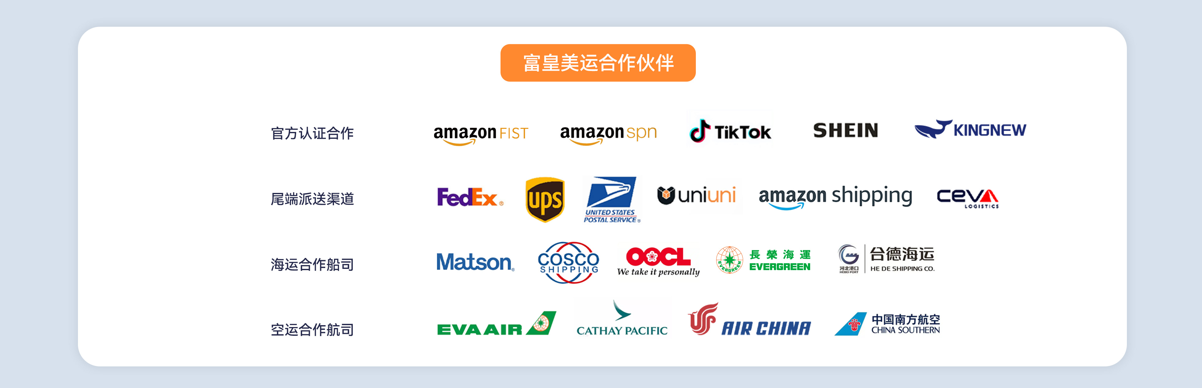 富皇美运是以中国-美国-东南亚三个经济体区域传统货代和跨境电商的数智化综合物流服务商,提供整柜直送/国际海运/国际空运/FBA头程/展会物流/海外清关、拖车、派送/海外仓储和一件代发服务。公司总部在深圳,分别在上海、厦门、福州、洛杉矶、新泽西、休斯顿、芝加哥、旧金山、新加坡、萨瓦纳设有分公司和仓库,多年来致力于跨境物流生态平台化建设,从传统国际货代到跨境电商物流,从直接和船东/航空公司签约到海外自建清关、拖车、仓库、转运体系,为跨境卖家和跨境品牌出海企业提供更稳定、更安全、更可控、更省心的物流体验,公司团队从业国际货运17年,根据各船东和航司时效和服务特点,结合海外本地优势,给客户提供更稳定、更经济的解决方案。